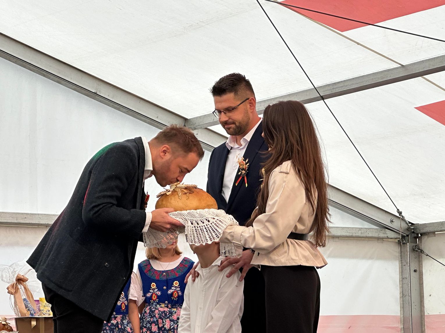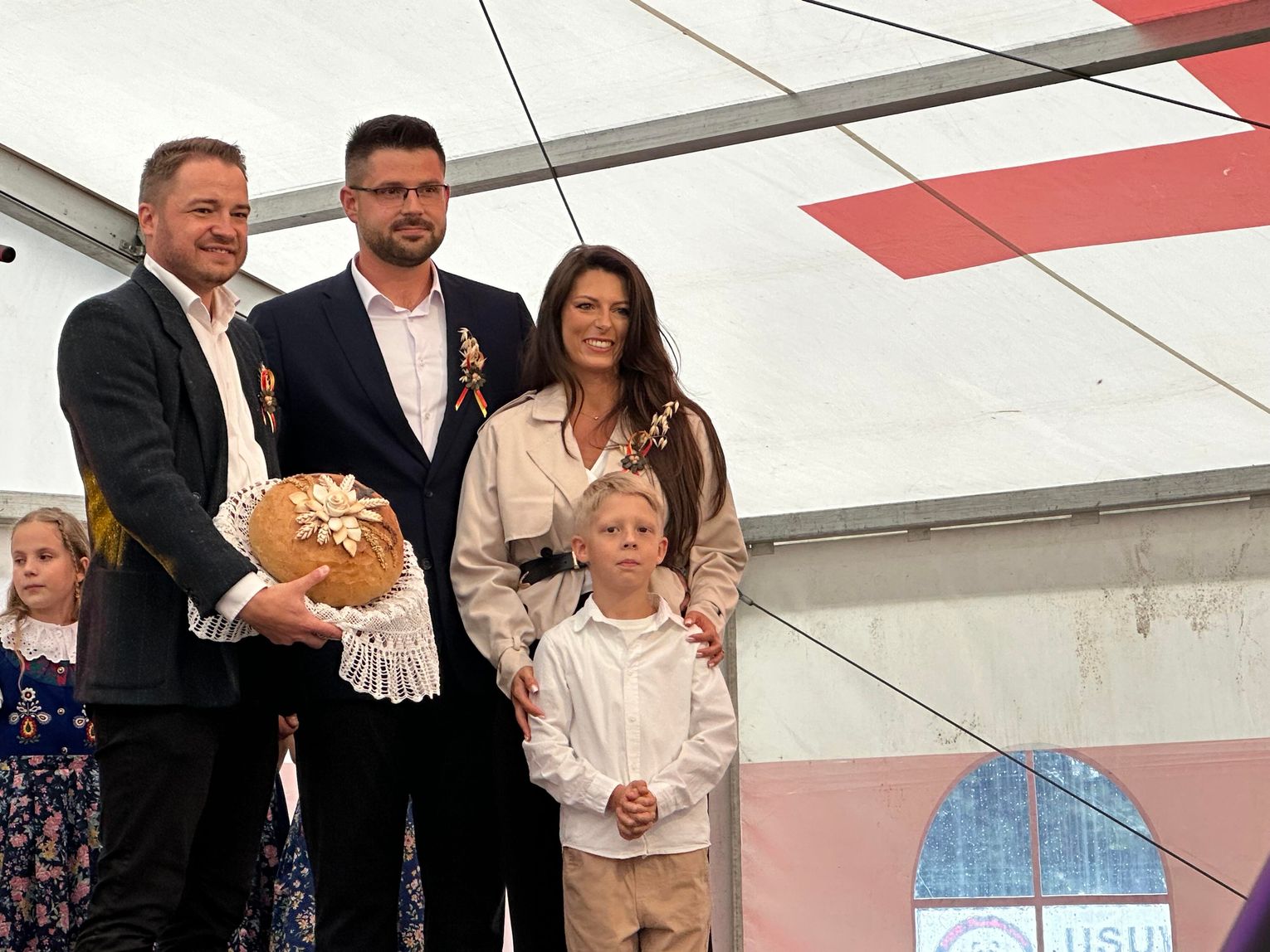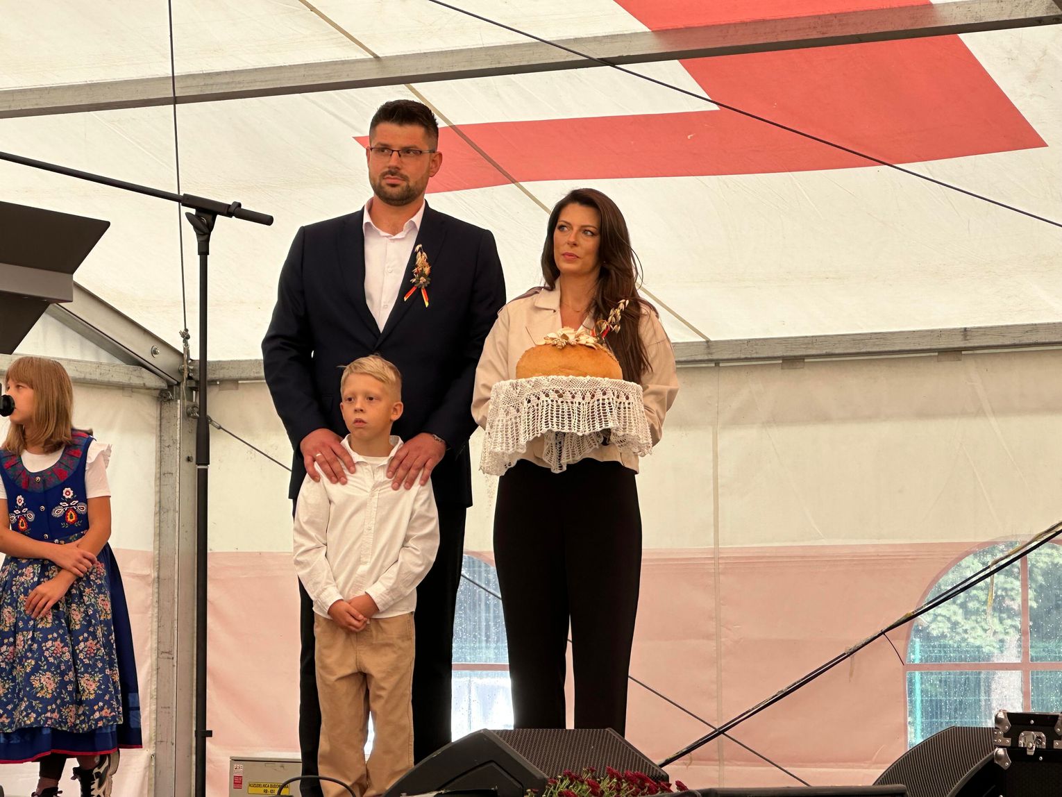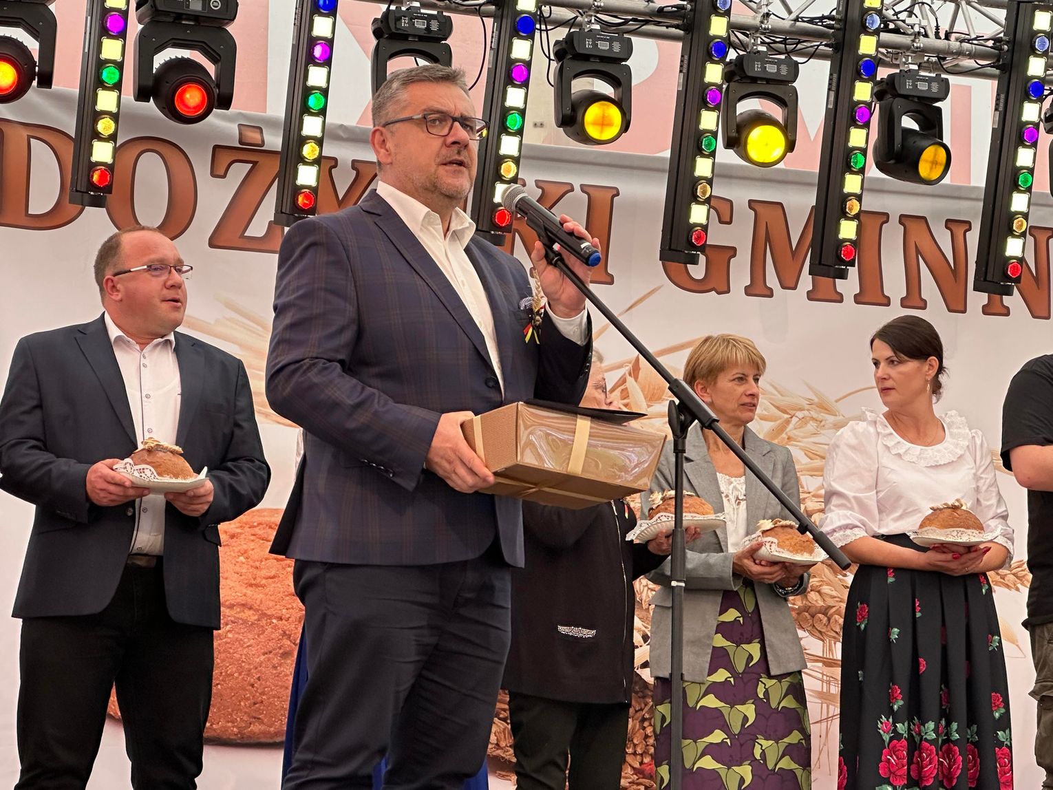 Po przemarszu miała miejsce część oficjalna oraz symboliczne przekazanie chleba z tegorocznych zbiorów. Na ręce burmistrza złożyli go starostowie dożynkowi, których honory pełnili Sandra i Maciej Szponarscy, czyli młodzi rolnicy z Ujazdu.