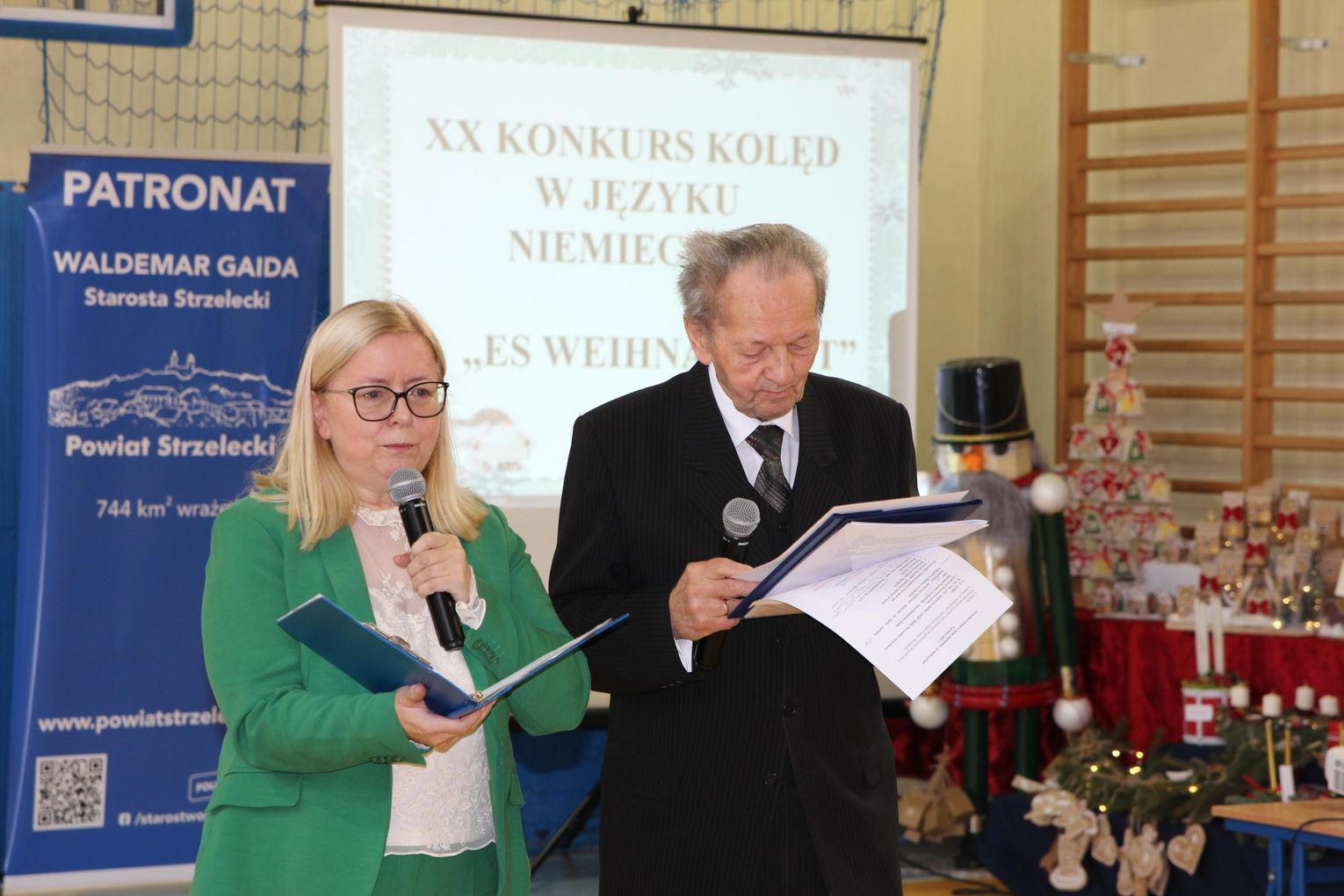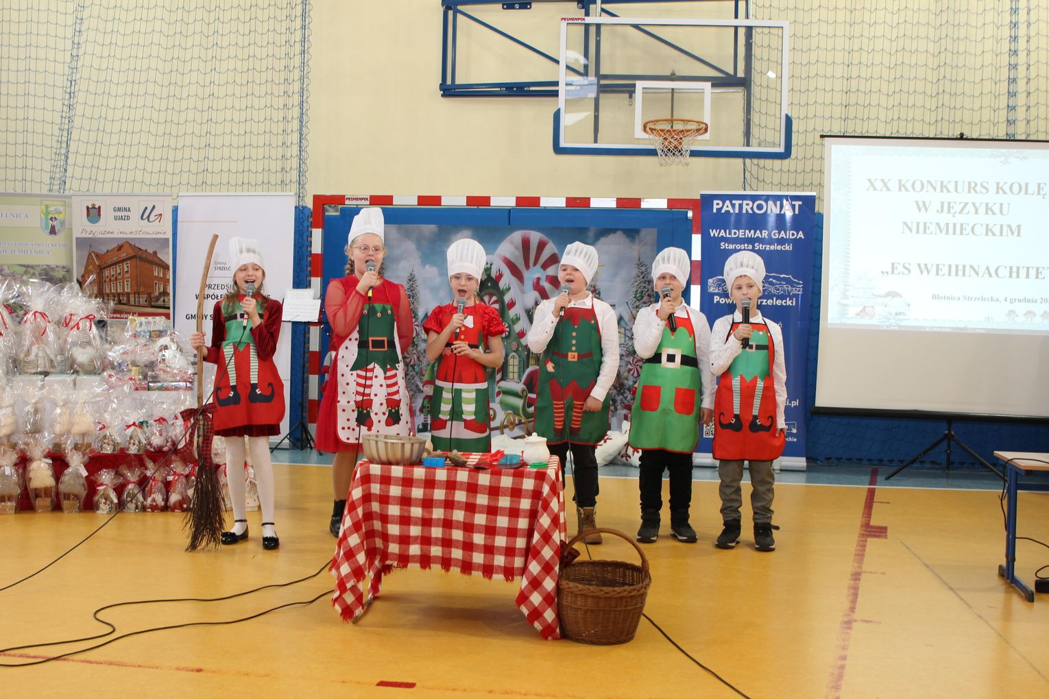 Po krótkim powitaniu przybyłych gości przez dyrektor szkoły Agnieszkę Sobczyk i Henryka Juretko, na środku sali pojawili się główni bohaterowie tego wydarzenia - uczniowie śpiewający i grający kolędy, pastorałki w języku niemieckim. Wśród utworów można było usłyszeć między innymi "Oh, wie schön das duftet" oraz "Es schneit".