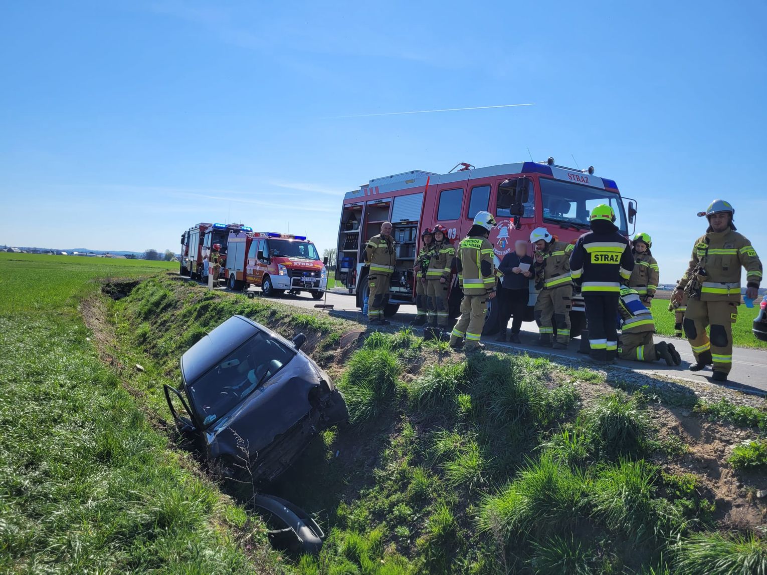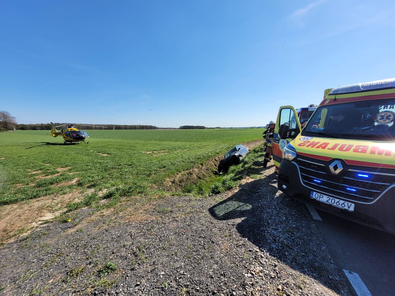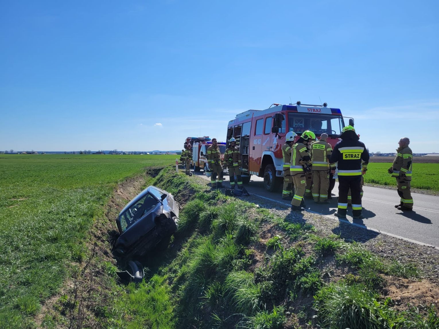 Po dotarciu na miejsce służby natrafiły na samochód leżący w rowie. Pojazdem podróżowały trzy starsze osoby. Dwie z nich zostały zabrane karetką pogotowia do szpitala w Strzelcach Opolskich. Ich stan zdrowia nie zagrażał życiu. Trzecia nie odniosła obrażeń.