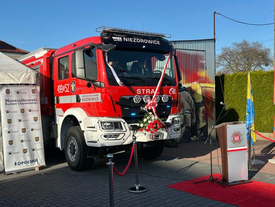 Strażacy odebrali pojazd już w październiku 2025 roku, a teraz został on oficjalnie przyjęty do służby. Klucze do wozu - na ręce naczelnika OSP w Niezdrowicach oraz kierowcy - symbolicznie przekazali burmistrz Ujazdu Hubert Ibrom i st. bryg. Paweł Poliwoda, komendant powiatowy Państwowej Straży Pożarnej w Strzelcach Opolskich, w asyście Teresy Tiszbierek, wiceprezes Zarządu Głównego Związku Ochotniczych Straży Pożarnych Rzeczypospolitej Polskiej.
