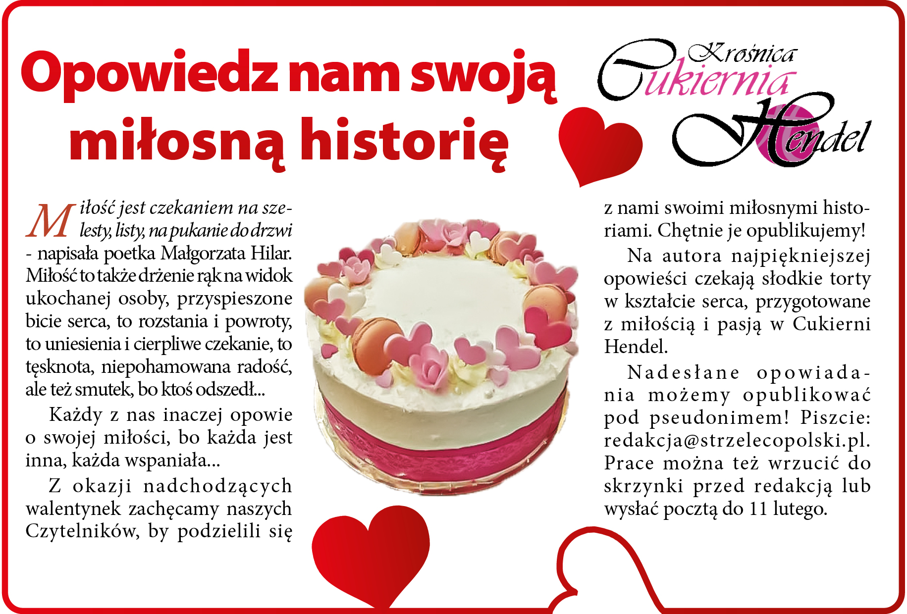 Na autora najpiękniejszej opowieści czekają słodkie torty w kształcie serca, przygotowane z miłością i pasją w Cukierni Hendel.