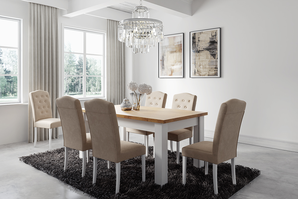 Osobom ceniącym ekskluzywne wnętrza prezentujemy niezwykle eleganckie meble do jadalni. W skład zestawu wchodzi duży drewniany stół HEROS z drewnianym blatem i białymi nogami (blat po rozłożeniu może mieć aż 340 cm długości!) oraz piękne krzesła U-8 z pikowanym oparciem. Stół wygodnie pomieści nawet 12-14 osób. Zestaw ten fantastycznie będzie się prezentował w reprezentacyjnej strefie jadalnianej urządzonej w stylu glamour lub shabby chic.